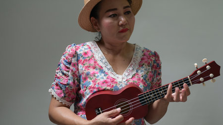 Adult woman plays ukulele. Wears straw hat, vibrant floral dress. Expressing musical passion, leisure activity. Calm studio setting, soft light highlights mood. Cultural recreation, joyful melody