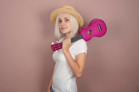 Beautiful young blonde woman in straw hat with ukulele on pink background