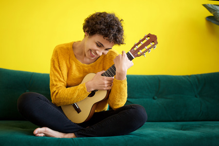 Portrait of happy young african american woman sitting on sofa with guitar instrument