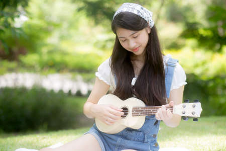 Happiness young asian woman sitting and playing ukulele while relaxation for entertainment is hobby on summer in the park, girl is musician doing activity with feeling positive, lifestyles concept.