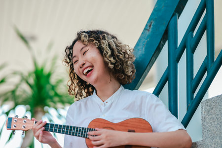 An Asian woman with curly, two-tone hair plays ukulele in an outdoor setting, radiating happiness and musical energy. A relaxed and artistic vibe with a natural and architectural elements background