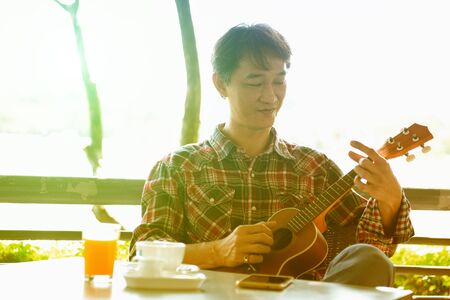 Handsome man Happiness, enjoy Ukulele guitar under sunlight in the afternoon