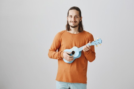Dreamy romantic male with beard in orange sweater holding cute ukulele and smiling cheerfully at camera, standing over gray background