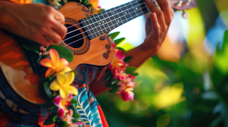 Vibrant ukulele playing in tropical setting with flowers