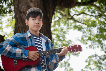 Asian cute muslim or islamic boy sitting and playing ukulele under the tree in local community park, recreational activity and hobby of all children around the world concept.