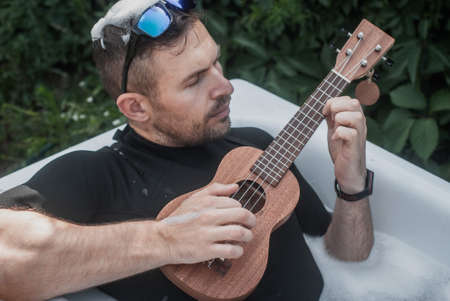 A man relaxes in the bathroom and plays the ukulele