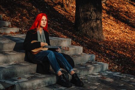 Sexy redhead girl with long hair plays the ukulele. Perfect woman portrait. Gorgeous strong and thick hair. Deep blue eyes. Natural beauty, clean skin, face and hair care