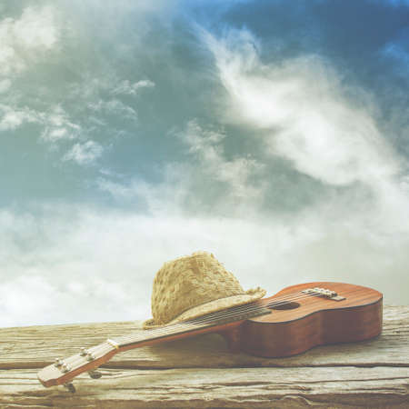 close-up ukulele and hat on wood and sky background. over light vintage style.