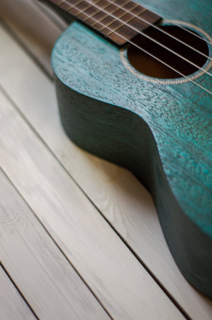 Photo depicts musical instrument ukulele guitar on a wooden table