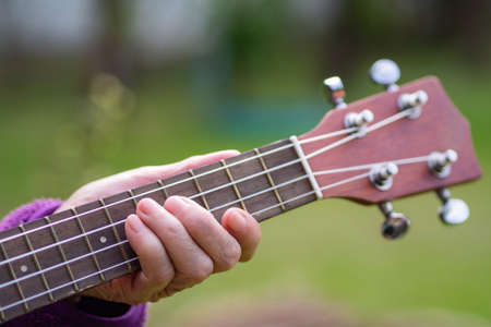 Close-up of hands senior woman holding ukulele in her garden.