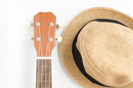 Ukulele and brown hat on white background