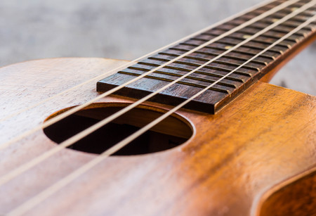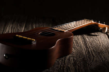Close up of ukulele on old wood background.