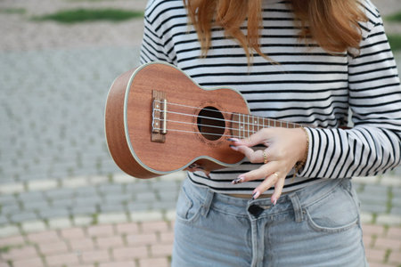 Ukulele in woman hands closeup playing an acoustic instrument ukulele in autumn outdoor with copy space, toned photo.