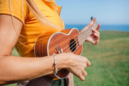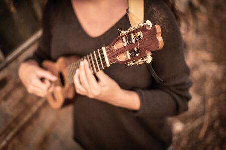Unrecognizable woman playing the ukulele outdoors