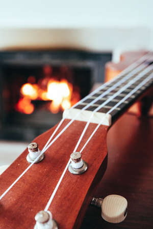Ukulele small guitar close up stings, fireplace on the background. Musical concept, guitar fret board macro, fire in chimney, cosy romantic atmosphere.