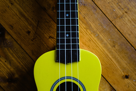 Small yellow ukulele on wooden floor ready to be played