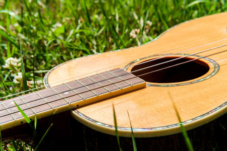 Acoustic baritone ukulele guitar laying in a grass field