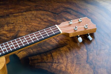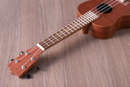 Close-up of a ukulele fretboard - small light brown instrument on beautiful wooden table.