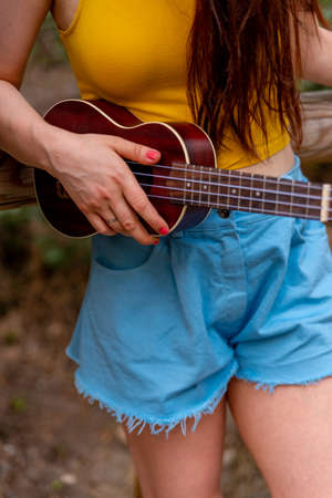 Red-haired girl with long hair plays on the ukulele in the park. School, music education concept, student learns to play the string instrument. Hands of a musician, classical, melody, creativity