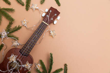 Festive composition ukulele guitar fir branches and lights of Christmas garland on a beige background space for text