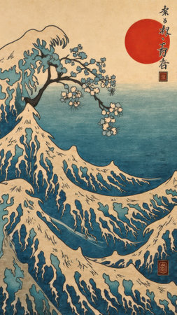 Cherry blossom branch with blue ocean waves and red sun in traditional Japanese art. That the image is generated using AI.