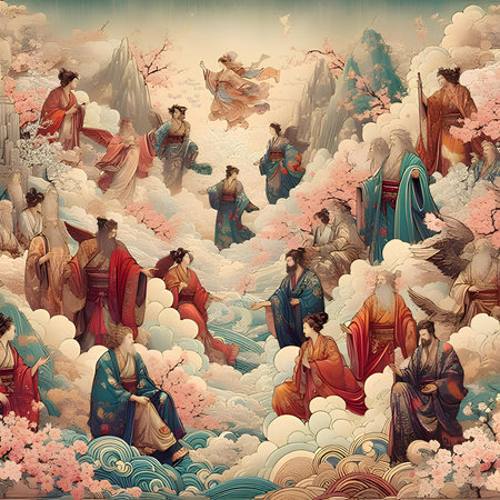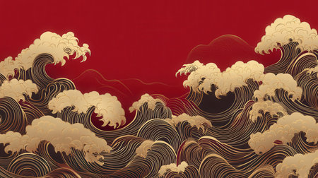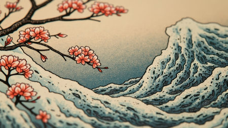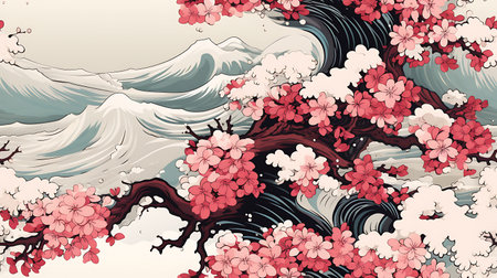 Sakura blossoms and stylized waves in Asian-inspired art print. That the image is generated using AI.