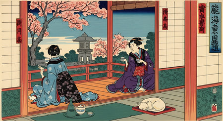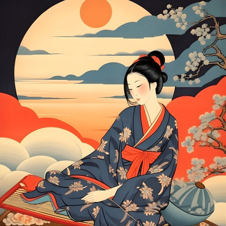 Illustration of a Japanese woman in traditional clothing on a terrace