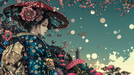 Illustration of japanese girl in traditional kimono.