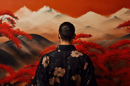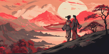 Man and woman, beautiful Japanese landscape, sunset. Traditional Japanese painting. AI generative.