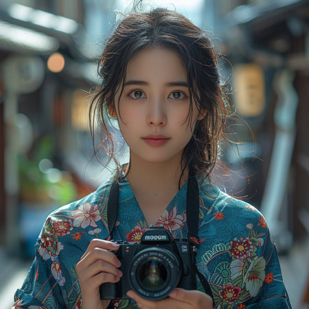 Young beautiful asian woman with camera in japanese style.