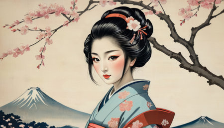 Beautiful japanese geisha in kimono with cherry blossom