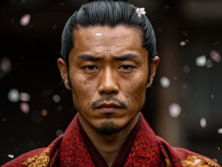Samurai warrior in traditional armor amid cherry blossoms