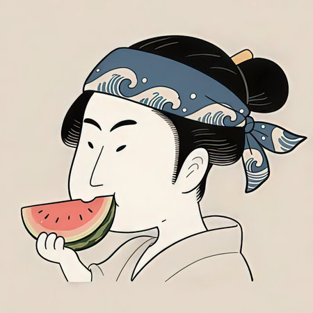 Illustration of a Japanese geisha eating a slice of watermelon
