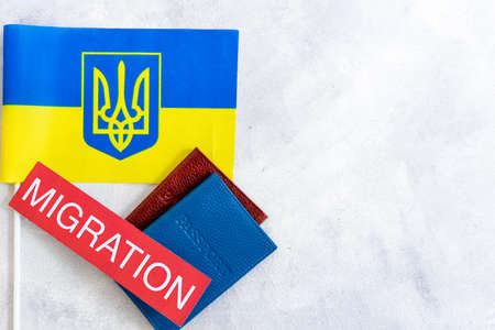Ukrainian refugees migration concept. Ukraine flag and passport