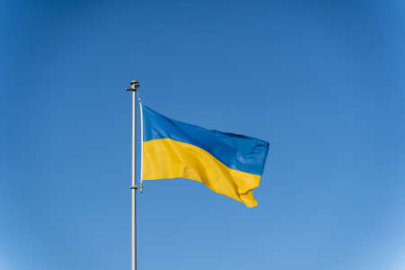 Ukrainian flag of yellow-blue colors on the background of clear blue sky