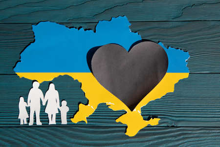 There is no war. People cut out of paper on a blue and yellow background. conceptual war in Ukraine