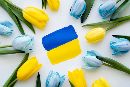 Top view of painted ukrainian flag in frame of blue and yellow tulips on white background