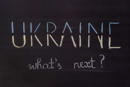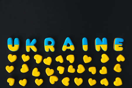 Yellow Ukraine lettering on blue background. Ukraine Conflict
