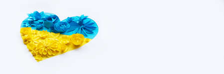 Heart shaped flag of Ukraine in female hands. The concept of solidarity with the citizens of Ukraine.