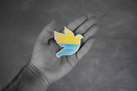 The concept of ending the war in Ukraine. Dove of peace in male hand.