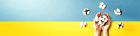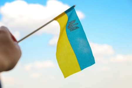 Defocus Ukraine flag. Large national symbol fluttering in blue sky. Support and help Ukraine, Independence Constitution Day, National holiday. Hand holding flag. Peace. Patriot. Out of focus.