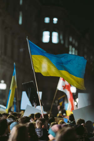 Downing Street, London | UK - 2022.02.26: Ukrainian people protest, thousands gather to demand tougher sanctions on Russia from British Government, EU and USA to stop the war in Ukraine