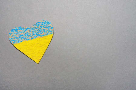 Heart in the colors of the Ukrainian flag. Stop the war concept. The heart from felt on blue background. Flat lay, a place for text, mockup, template, top view