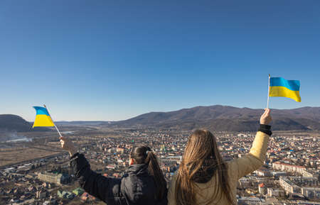 Ukraine. Uzhhorod April 19, 2022: Action in support of Ukraine during the war. Mothers with children with Ukrainian flags and suitcases.aggression