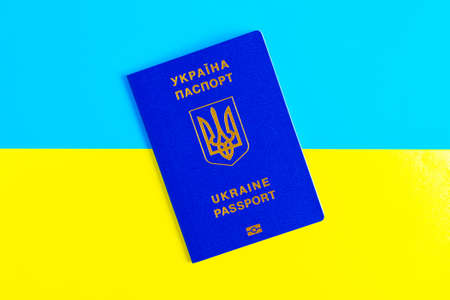 International passport against the background of the flag of Ukraine. Document for crossing the border.