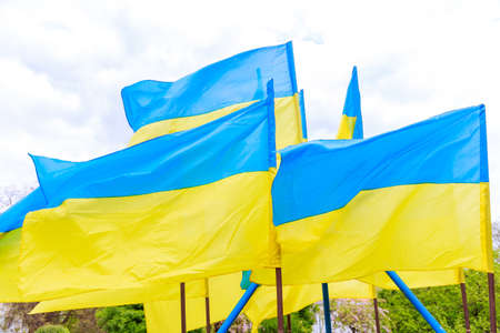 Flags of Ukraine close up on a windy day. The state symbol of Ukraine. History and traditions of Ukraine.