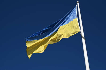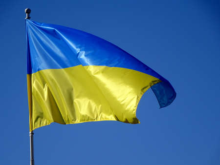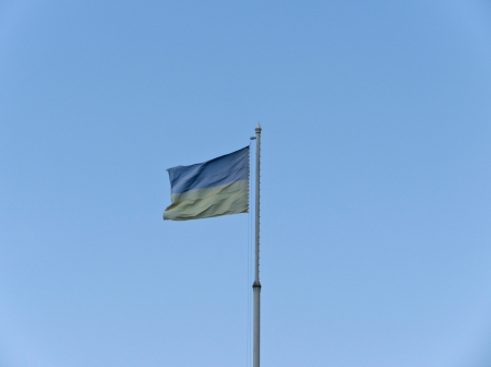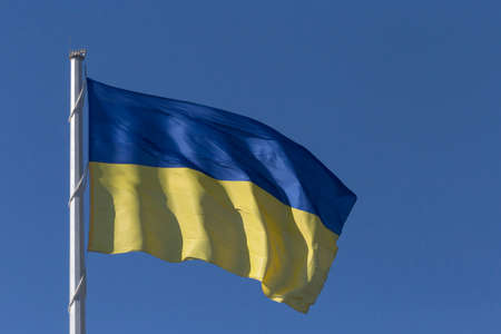 The blue yellow flag of Ukraine flies on a flagpole against a blue sky.