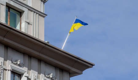 Ukrainian flag in the wind. Blue Yellow flag in the city of Kharkov.