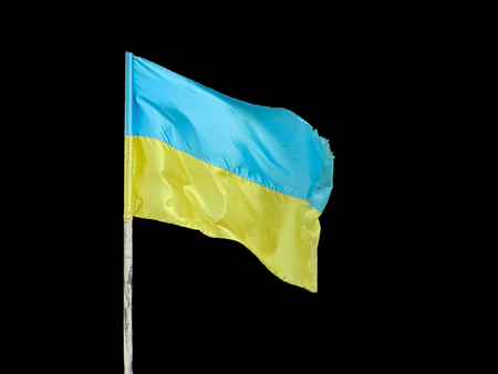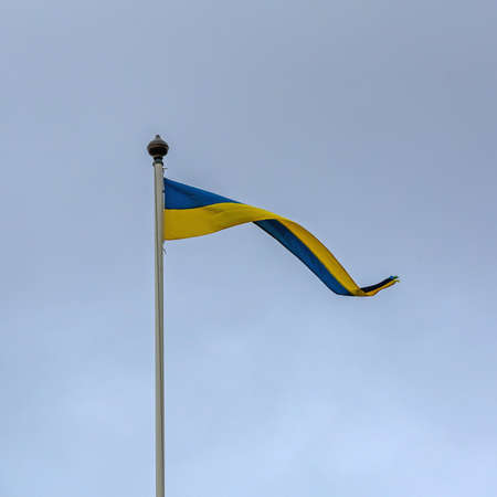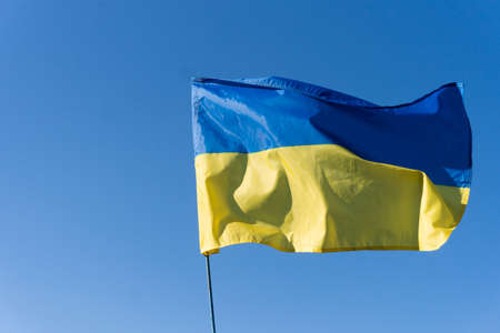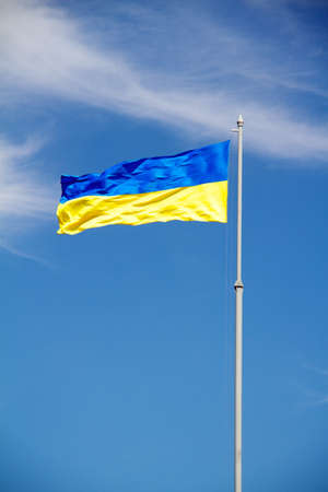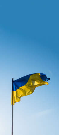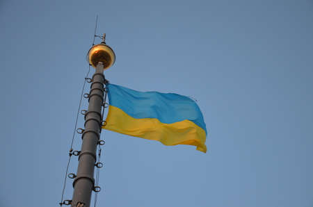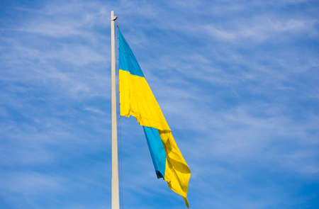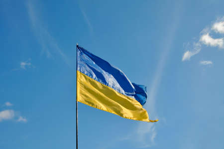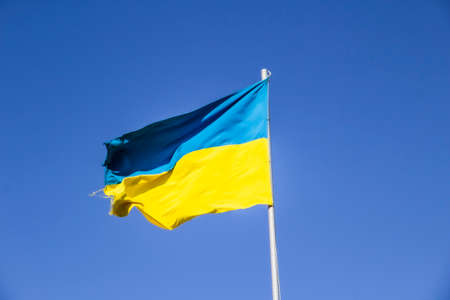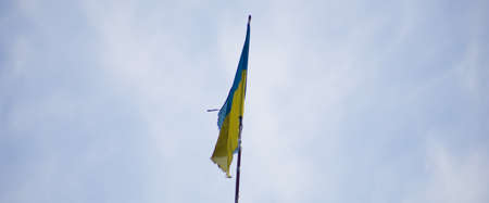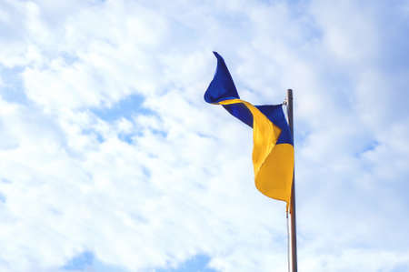 Ukrainian flag of yellow and blue colors branches in the wind against the sky.