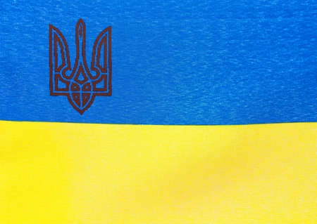 Close up of Ukrainian blue and yellow flag on grey background. Invasion attack escalation of Ukraine. No war.